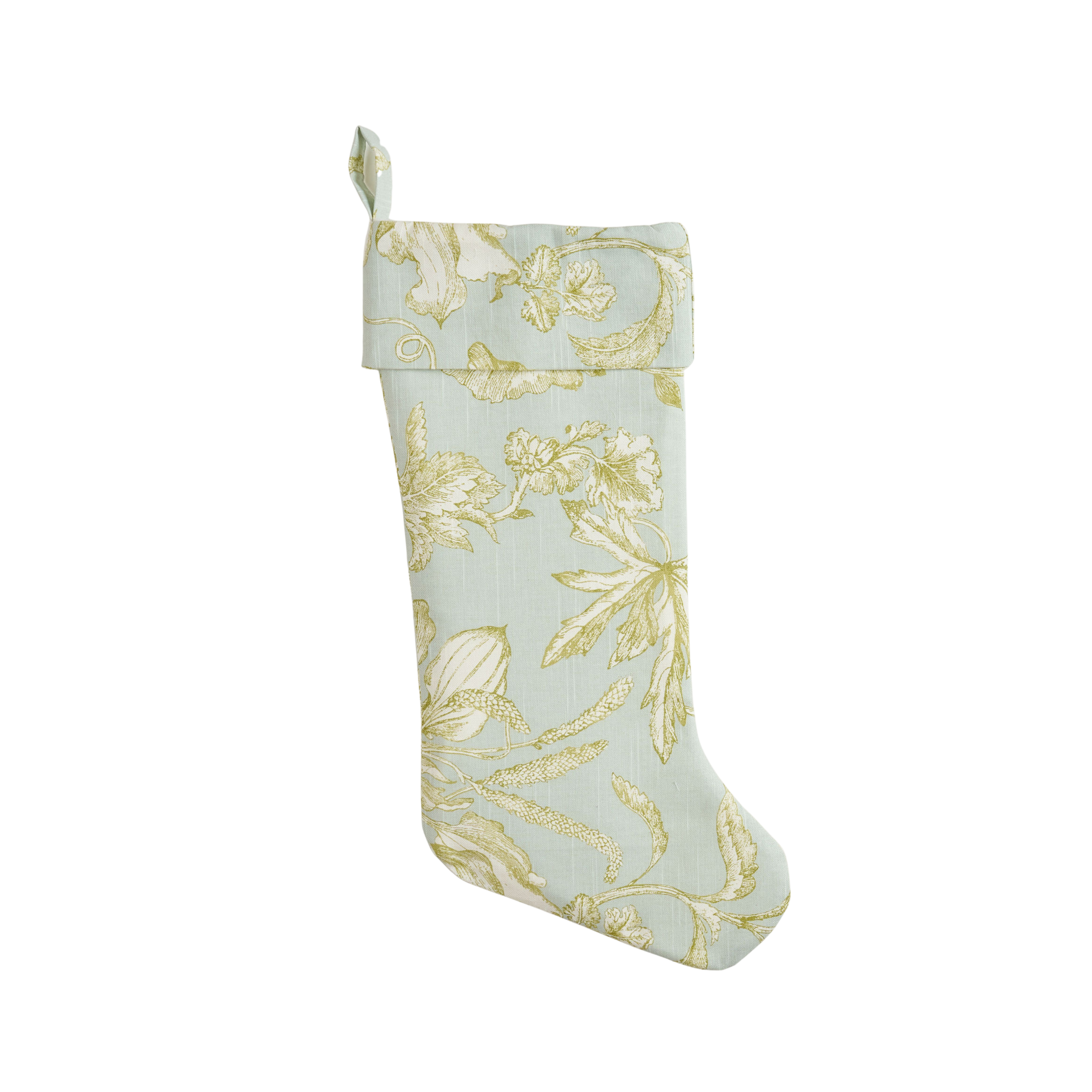 Deck with halls with our crowd-favorite Lillian Dew stocking this holiday season. This beautiful green, floral design and blue background will add a subtle touch of color to complement any space.