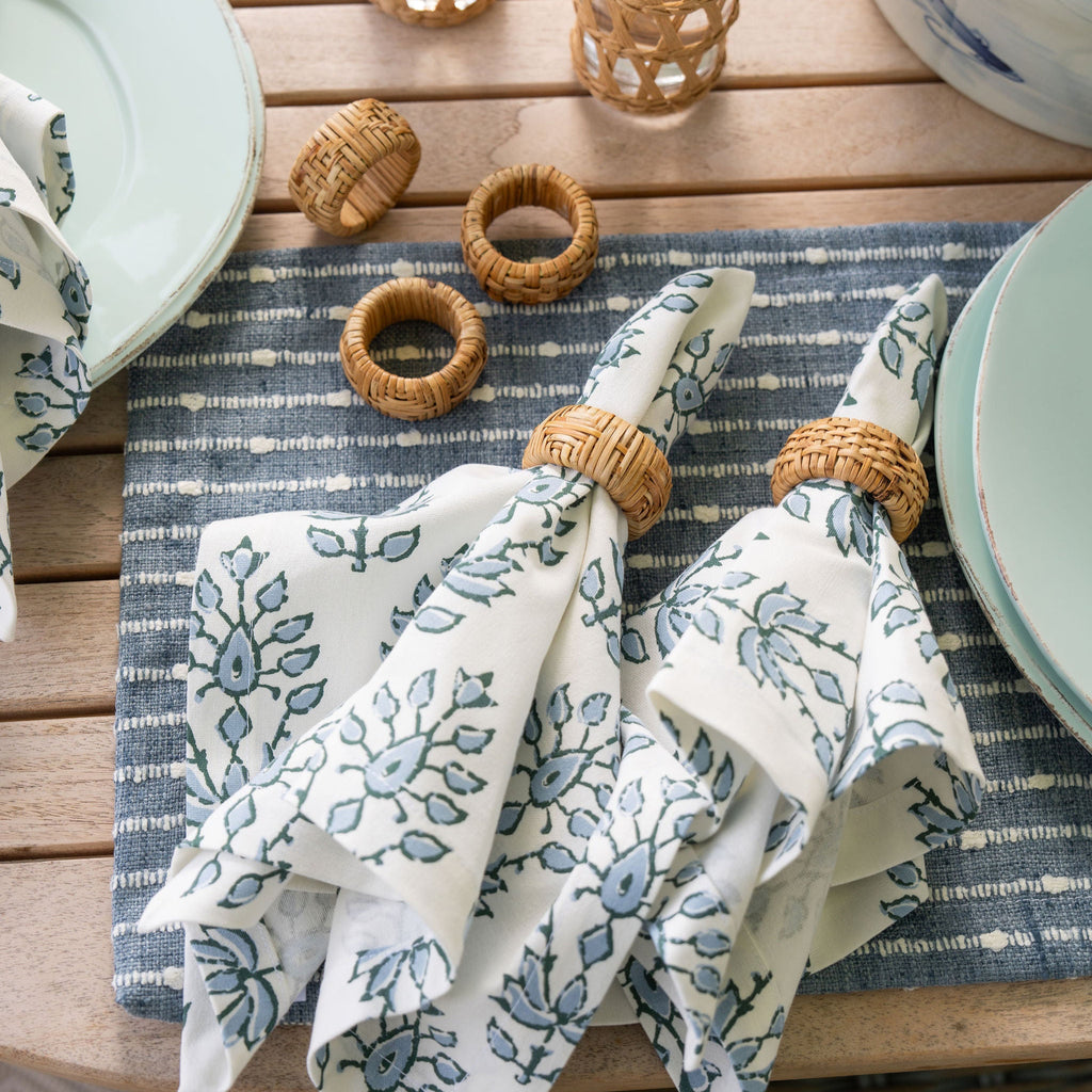 Our Fulton Lake dinner napkins are block printed on soft 100% cotton in a fresh yet classic blue motif that brings life to any setting. Pair with our coordinating Fulton Lake cocktail napkins to complete your table.